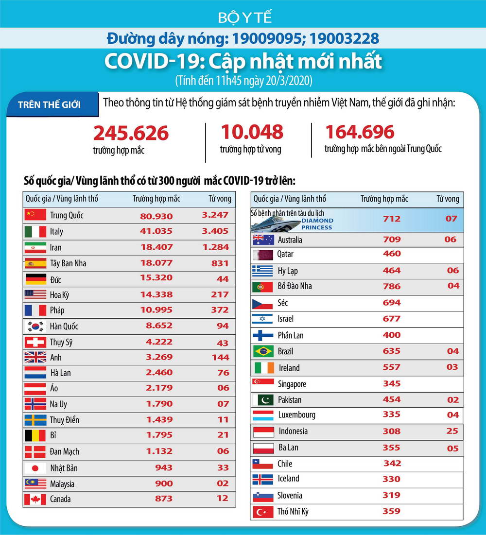 + Số liệu của Bộ Y tế Việt Nam cập nhật lúc 11g30 ngày 20-3-2020 cho biết cả thế giới có 245.626 người nhiễm virus nCoV COVID-19 (so với 218.741 người vào ngày hôm qua), trong đó đại lục Trung Quốc có 80.930 người. Có 10.048 người chết, trong đó 3.247 người ở đại lục Trung Quốc. Các nước bên ngoài đại lục Trung Quôc có 164.696 người nhiễm và 6.801 người chết. Tổng cộng có 180 quốc gia và vùng lãnh thổ có người nhiễm COVID-19