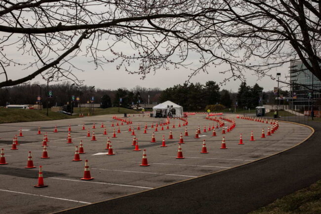 Một trạm xét nghiệm drive-through coronavirus test (lấy mẫu xét nghiệm trong khi người ta vẫn ngồi trên xe) tại Bergen County Community College ở Paramus, (bang New Jersey, Mỹ) ngày 20-3-2020. (Ảnh: Bryan Anselm for The New York Times/ Internet. Thanks.)
