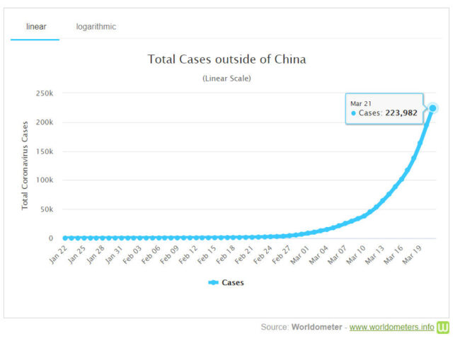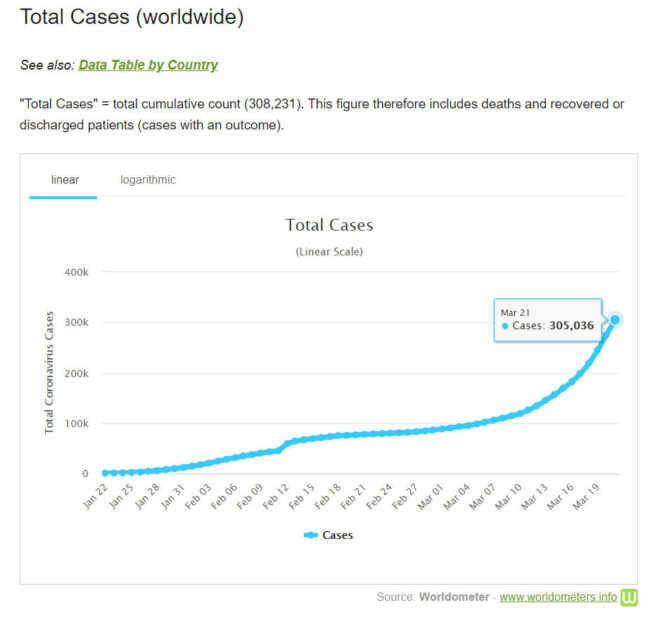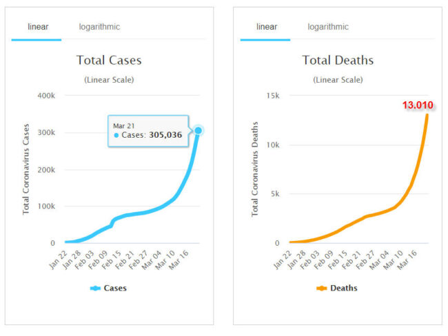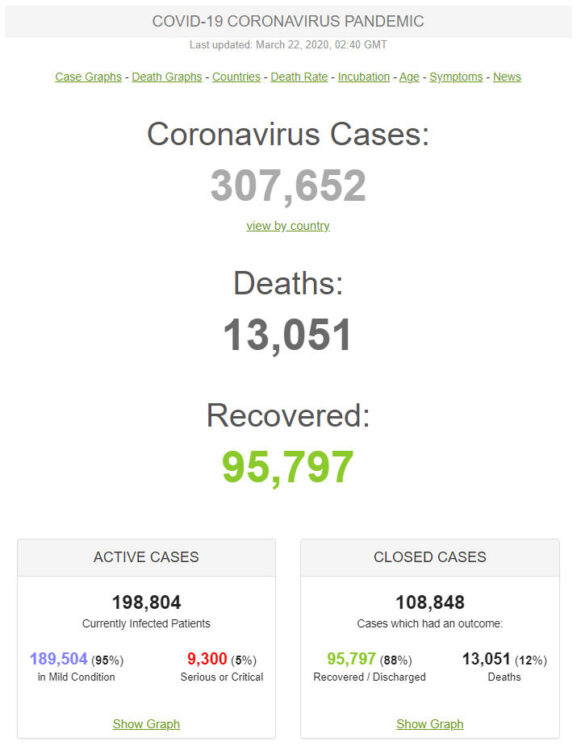 Thế giới trải qua một ngày 21-3-2020 với số người nhiễm và chết trong một ngày tiếp tục rất cao, có thêm 29.439 ca nhiễm mới (hôm trước tăng 30.660) và thêm 1.623 người chết (hôm trước tăng 1.355 ca). Tốc độ tăng ớn lạnh trong mấy ngày nay. Chiều 18-3, số người nhiễm vượt mốc 200.000 và người chết vượt mốc 8.000. Tối 21-3, vượt mốc 300.000 người nhiễm và 13.000 người chết. Sáng 22-3, thế giới đã có 188 nước và vùng lãnh thổ có người nhiễm novel coronavirus (SARS-CoV-2) với 307.652 người nhiễm (198.803 người đang điều trị – active cases), có 226.598 người ở 187 nước và vùng lãnh thổ bên ngoài đại lục Trung Quốc. Chỉ trong 4 ngày, thế giới liên tục vượt mốc 8.000, rồi 9.000, 10.000, 11.000, 12.000 và sáng 22-3 là 13.000 người chết. Sáng 22-3 ghi nhận có 13.051 người chết (chiếm 4,24% so với tổng nhiễm); và 95.797 người đã được chữa khỏi (chiếm 31,13% so với tổng nhiễm). Số người nhiễm và tử vong bên ngoài đại lục Trung Quốc đang ngày càng nhiều hơn ở đại lục: 227.133 người nhiễm (73,70%) so với 81.054 người nhiễm (26,30%).