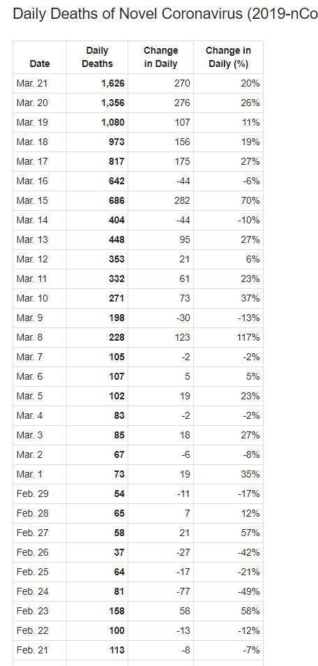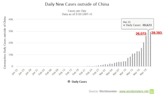 - Ngày 21-3-2020, số người mới tử vong vì virus nCoV COVID-19 là 1.623 người (so với 1.355 người của ngày 19-3). Trong khi đại lục Trung Quốc chỉ có thêm 6 người chết (so 7 người hôm trước), các nước khác tăng tới 1.617 người chết (so với mức tăng 1.348 người hôm trước). Từ ngày 24-2 tới 4-3 có mức tăng tử vong hàng ngày dưới 100 ca.