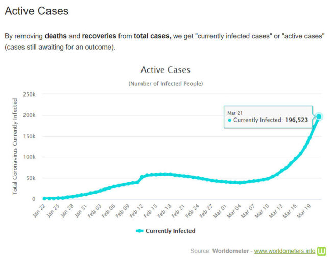 Có 1.623 người chết trong ngày 21-3 (so với 1.355 người ngày hôm trước). Số người được chữa khỏi COVID-19 hiện là 95.797 người (tăng từ 91.912 người vào sáng hôm trước). Trừ đi số đã xác định (outcome) bao gồm tử vong, khỏi bệnh và xuất viện (tổng cộng 108.848 người), số người hiện đang nhiễm là 198.804 người (tăng từ 172.622 người sáng hôm trước, tăng trở lại từ ngày 6-3).