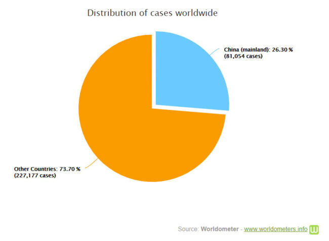 + Trang thông tin cập nhật về dịch Coronavirus COVID-19 Global Cases Johns Hopkins CESE của trường Đại học Y Johns Hopkins, một trường có tiếng ở Mỹ, tính tới sáng 22-3-2020 (theo giờ VN), ghi nhận: có 307.104 trường hợp nhiễm virus được xác nhận trên thế giới (so với 275.427 trường hợp ngày hôm qua), trong đó có 81.345 ca ở Trung Quốc – trừ Taiwan (so với 81.279 ca ngày hôm qua). Có 13.044 người tử vong (so với 11.397 người hồi sáng qua). Và có 92.372 người bệnh đã được điều trị hồi phục (so với 88.235 người ngày hôm qua), trong đó có 59.432 người ở tỉnh Hubei tâm dịch. Trang này ghi nhận có 17 ca được chữa khỏi ở Việt Nam (ngày 20-3, Việt Nam công bố đã chữa khỏi thêm 1 người trong giai đoạn 2, tổng cộng 17 người đã được chữa khỏi và xuất viện).