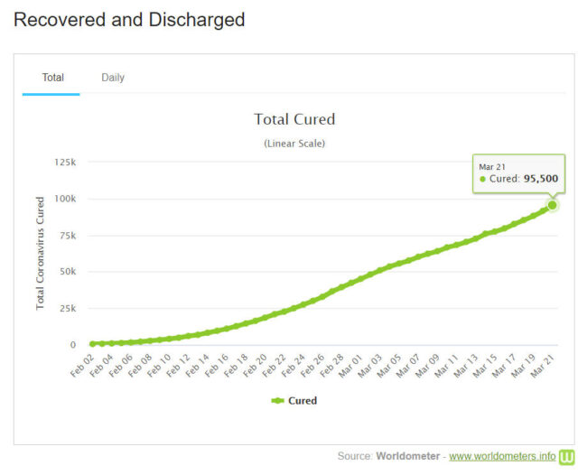 - Tới sáng ngày 22-3-2020, có 95.797 người nhiễm nCoV COVID-19 đã được chữa khỏi (chiếm 31,13% so với tổng người nhiễm; tỷ lệ này là 33,30% hồi sáng hôm trước, mấy ngày gần đây giảm dần do số người nhiễm mới ở bên ngoài đại lục tăng quá nhanh).