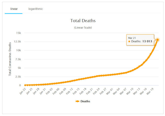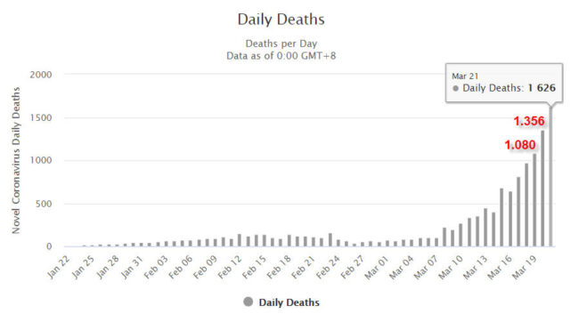 Ngày 21-3 là ngày có số lượng người tử vong cao nhất (1.623 người) kể từ khi phát hiện ca tử vong đầu tiên ngày 9-1-2020. Ngày 20-3 có 1.355 người chết, 19-3 (1.084 người chết), ngày 18-3 (973 người chết), ngày 17-3 (817 người chết, ngày 16-3 (641 người chết), ngày 15-3 (686 người chết), ngày 14-3 (404 người chết), ngày 13-3 (448 người chết), ngày 12-3 (354 người chết), ngày 11-3 (332 người chết), ngày 10-3 (271 người chết), ngày 9-3 (198 người chết), ngày 8-3 (228 người chết), ngày 7-3 (có 105 người chết). Tỷ lệ người tử vong so với số nhiễm trong nhiều ngày gần đây vẫn tiếp tục dao động khi tăng lúc giảm, dù nhẹ (sáng 22-3-2020 là 4,24%, so với 4,13% của hôm trước).