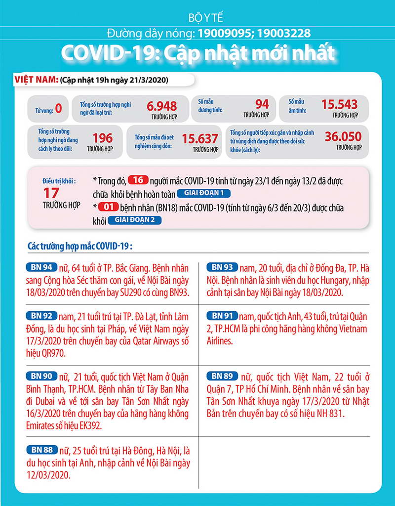 Ngày 21-3-2020, Bộ Y tế Việt Nam công bố có 3 ca nhiễm mới (BN92 tới BN94). Như vậy, Việt Nam có 94 ca nhiễm virus nCoV COVID-19 (gồm 67 người Việt Nam, 2 người Trung Quốc, 1 người Mỹ gốc Việt, và 24 người nước ngoài khác). Giai đoạn 1 (từ 23-1 tới 5-3-2020) có 16 người nhiễm (tính từ ngày 23-1 đến ngày 13-2) đã được chữa khỏi bệnh hoàn toàn. Ca cuối cùng của Giai đoạn 1 đã xuất viện ngày 23-2. Ở Giai đoạn 2, 1 bệnh nhân (BN18) mắc COVID-19 được chữa khỏi (xuất viện sáng 20-3-2020).