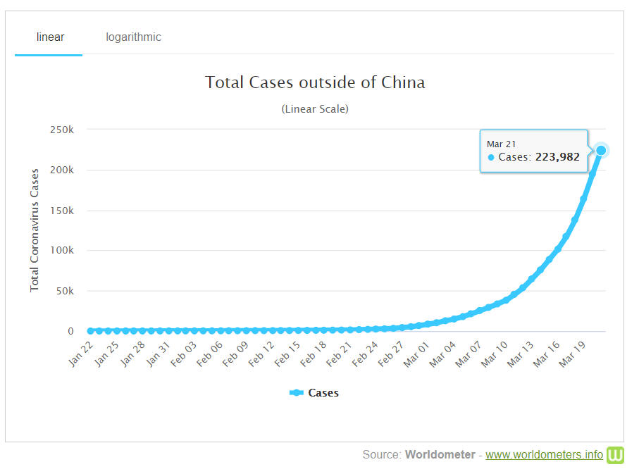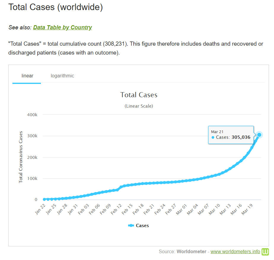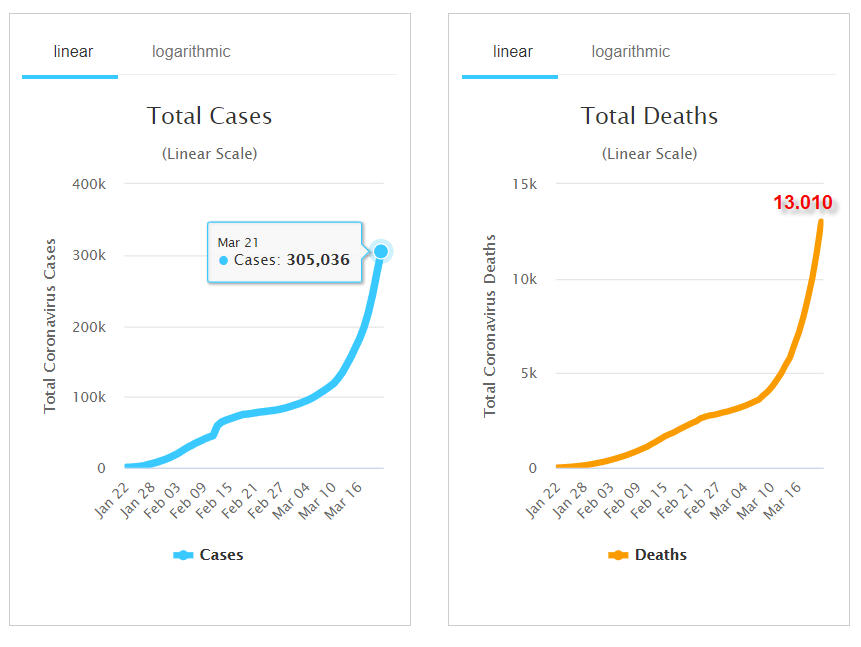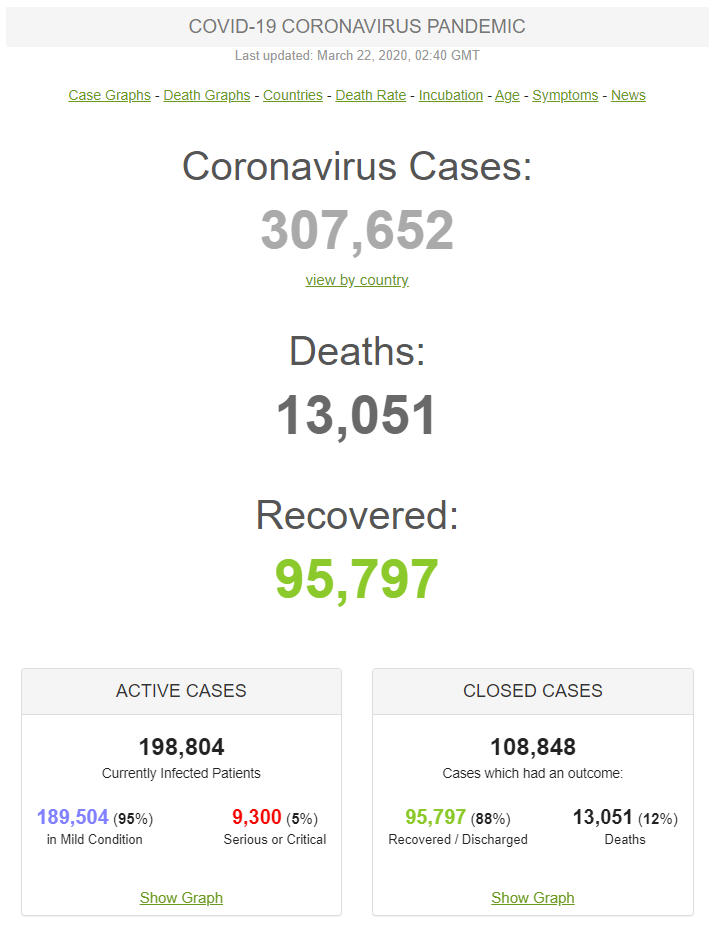 Thế giới trải qua một ngày 21-3-2020 với số người nhiễm và chết trong một ngày tiếp tục rất cao, có thêm 29.439 ca nhiễm mới (hôm trước tăng 30.660) và thêm 1.623 người chết (hôm trước tăng 1.355 ca). Tốc độ tăng ớn lạnh trong mấy ngày nay. Chiều 18-3, số người nhiễm vượt mốc 200.000 và người chết vượt mốc 8.000. Tối 21-3, vượt mốc 300.000 người nhiễm và 13.000 người chết. Sáng 22-3, thế giới đã có 188 nước và vùng lãnh thổ có người nhiễm novel coronavirus (SARS-CoV-2) với 307.652 người nhiễm (198.803 người đang điều trị – active cases), có 226.598 người ở 187 nước và vùng lãnh thổ bên ngoài đại lục Trung Quốc. Chỉ trong 4 ngày, thế giới liên tục vượt mốc 8.000, rồi 9.000, 10.000, 11.000, 12.000 và sáng 22-3 là 13.000 người chết. Sáng 22-3 ghi nhận có 13.051 người chết (chiếm 4,24% so với tổng nhiễm); và 95.797 người đã được chữa khỏi (chiếm 31,13% so với tổng nhiễm). Số người nhiễm và tử vong bên ngoài đại lục Trung Quốc đang ngày càng nhiều hơn ở đại lục: 227.133 người nhiễm (73,70%) so với 81.054 người nhiễm (26,30%).