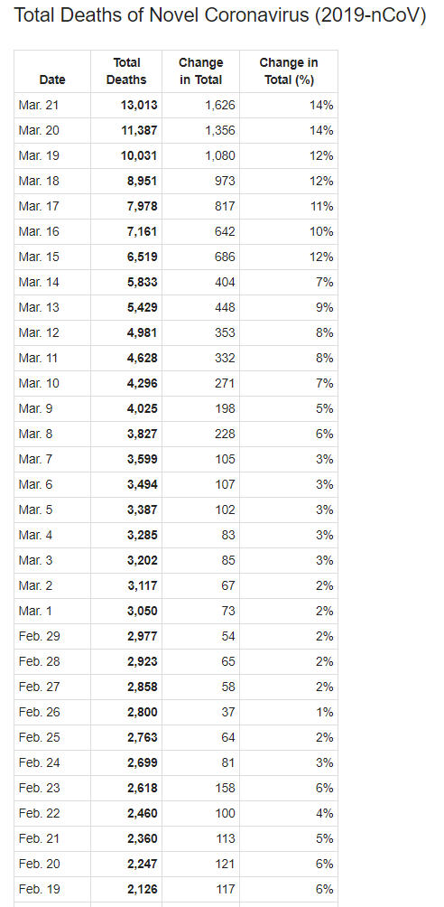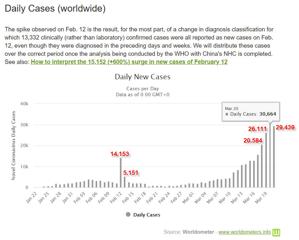 - Ngày 21-3-2020, số người mới tử vong vì virus nCoV COVID-19 là 1.623 người (so với 1.355 người của ngày 19-3). Trong khi đại lục Trung Quốc chỉ có thêm 6 người chết (so 7 người hôm trước), các nước khác tăng tới 1.617 người chết (so với mức tăng 1.348 người hôm trước). Từ ngày 24-2 tới 4-3 có mức tăng tử vong hàng ngày dưới 100 ca.