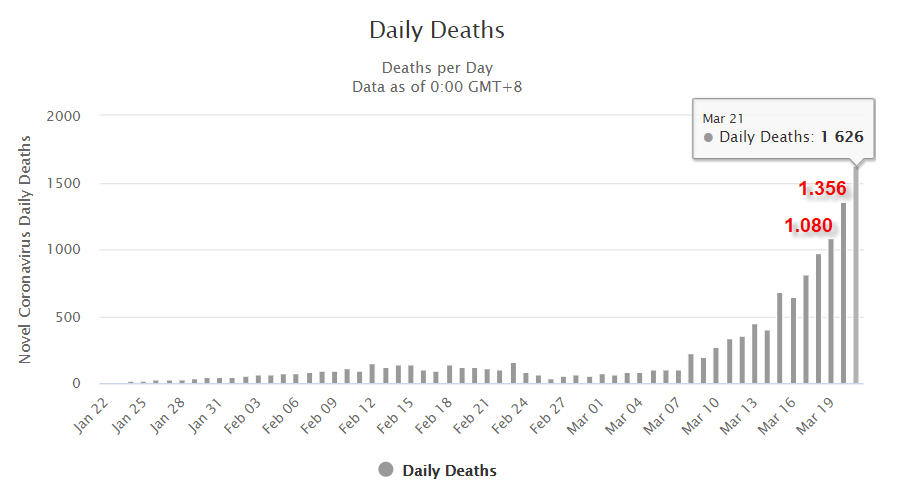 Ngày 21-3 là ngày có số lượng người tử vong cao nhất (1.623 người) kể từ khi phát hiện ca tử vong đầu tiên ngày 9-1-2020. Ngày 20-3 có 1.355 người chết, 19-3 (1.084 người chết), ngày 18-3 (973 người chết), ngày 17-3 (817 người chết, ngày 16-3 (641 người chết), ngày 15-3 (686 người chết), ngày 14-3 (404 người chết), ngày 13-3 (448 người chết), ngày 12-3 (354 người chết), ngày 11-3 (332 người chết), ngày 10-3 (271 người chết), ngày 9-3 (198 người chết), ngày 8-3 (228 người chết), ngày 7-3 (có 105 người chết). Tỷ lệ người tử vong so với số nhiễm trong nhiều ngày gần đây vẫn tiếp tục dao động khi tăng lúc giảm, dù nhẹ (sáng 22-3-2020 là 4,24%, so với 4,13% của hôm trước).