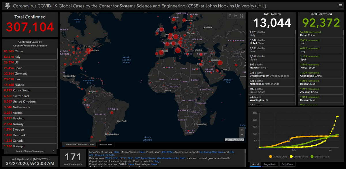 + Trang thông tin cập nhật về dịch Coronavirus COVID-19 Global Cases Johns Hopkins CESE của trường Đại học Y Johns Hopkins, một trường có tiếng ở Mỹ, tính tới sáng 22-3-2020 (theo giờ VN), ghi nhận: có 307.104 trường hợp nhiễm virus được xác nhận trên thế giới (so với 275.427 trường hợp ngày hôm qua), trong đó có 81.345 ca ở Trung Quốc – trừ Taiwan (so với 81.279 ca ngày hôm qua). Có 13.044 người tử vong (so với 11.397 người hồi sáng qua). Và có 92.372 người bệnh đã được điều trị hồi phục (so với 88.235 người ngày hôm qua), trong đó có 59.432 người ở tỉnh Hubei tâm dịch. Trang này ghi nhận có 17 ca được chữa khỏi ở Việt Nam (ngày 20-3, Việt Nam công bố đã chữa khỏi thêm 1 người trong giai đoạn 2, tổng cộng 17 người đã được chữa khỏi và xuất viện).