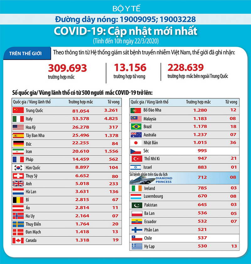 + Số liệu của Bộ Y tế Việt Nam cập nhật lúc 10g00 ngày 22-3-2020 cho biết cả thế giới có 309.693 người nhiễm virus nCoV COVID-19 (so với 275.132 người vào ngày hôm qua), trong đó đại lục Trung Quốc có 81.054 người. Có 13.156 người chết, trong đó 3.261 người ở đại lục Trung Quốc. Các nước bên ngoài đại lục Trung Quốc có 229.639 người nhiễm và 9.895 người chết. Tổng cộng có 188 quốc gia và vùng lãnh thổ có người nhiễm COVID-19.