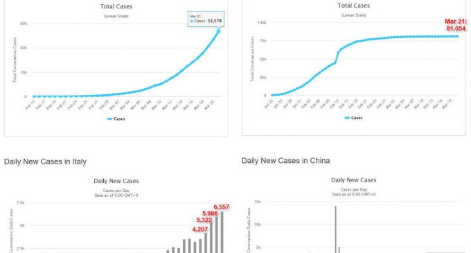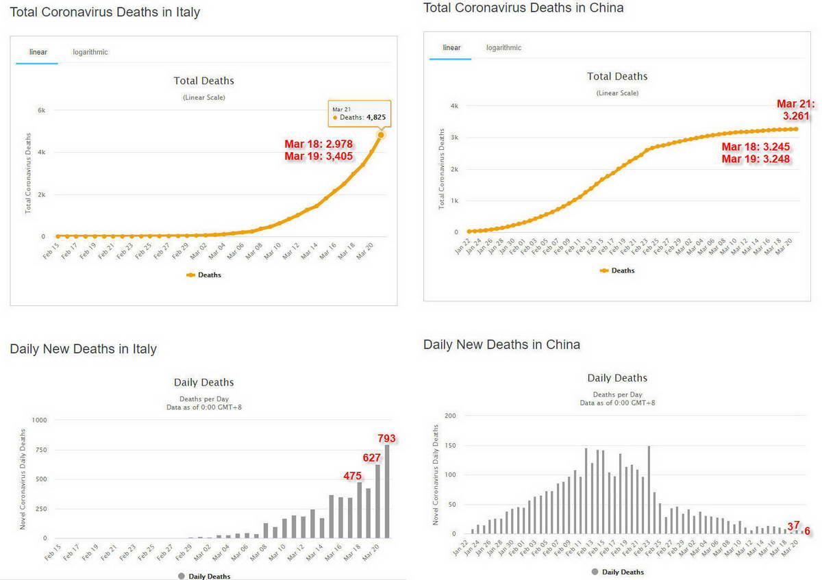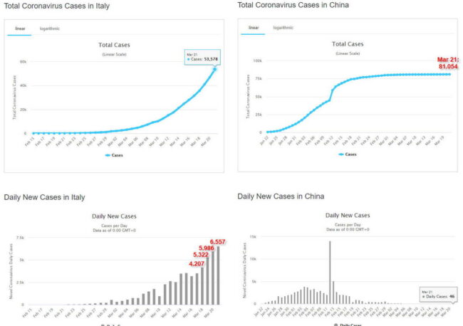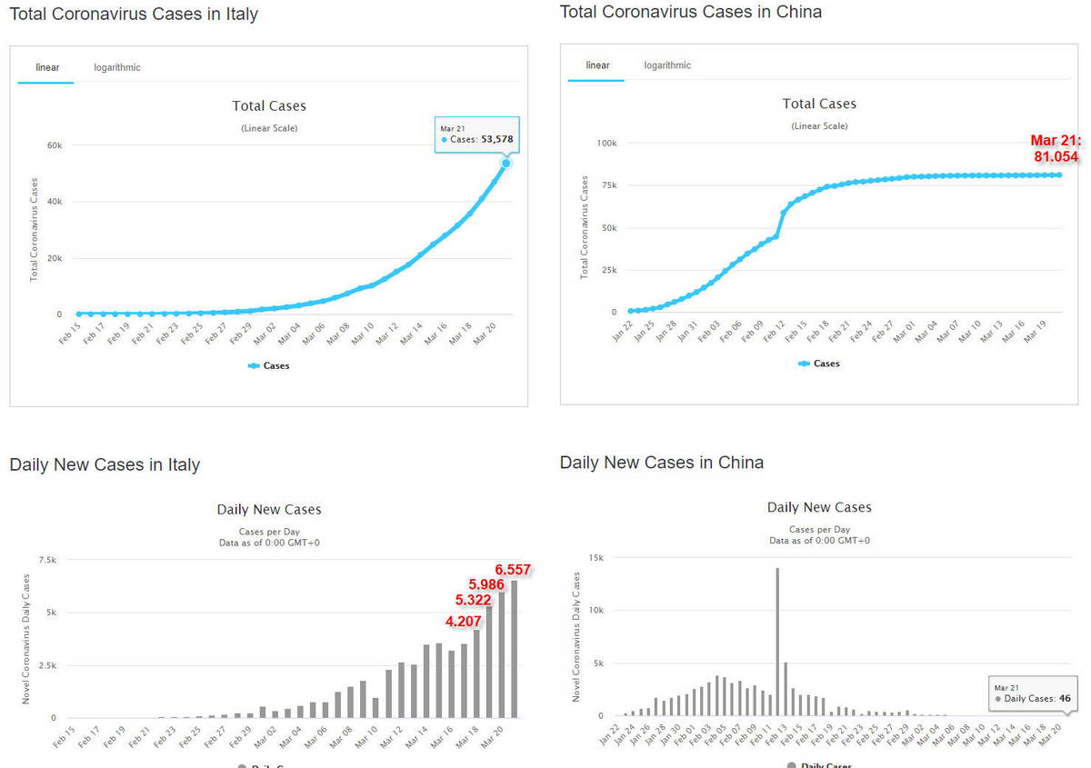 Còn ở hạng mục tổng bệnh nhân nhiễm, vào ngày 21-3, Ý là 53.578 ca, trong khi Trung Quốc là 81.051 ca. Tốc độ chạy của Ý là đang nước rút với hơn 5.000 – hơn 6.000 người mới/ngày; trong khi Trung Quốc đang lê bước với 1 chữ số tăng mỗi ngày.