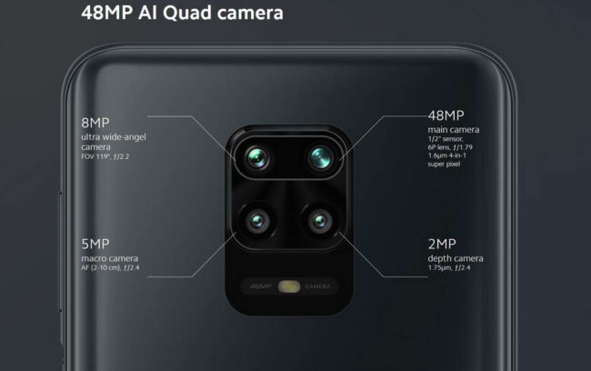 Redmi Note 9S trang bị cụm 4 camera sau bao gồm ống kính chính 48MP, cảm biến 1/2 inch; ống kính góc siêu rộng 8MP, ống kính macro 5MP cận cảnh và ống kính đo độ sâu 2MP đáp ứng đa dạng nhu cầu nhiếp ảnh của người dùng.