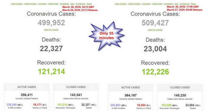 Khi bạn đọc những dòng này vào nửa khuya 26-3-2020 theo giờ Việt Nam, số người nhiễm novel coronavirus gây đại dịch toàn cầu COVID-19 đã vượt qua mốc 500.000 người. Nửa triệu người ở 198 nước và vùng lạnh thổ đã là nạn nhân của đại dịch viêm đường hô hấp cấp thể nặng dạng mới bùng phát từ Wuhan (Trung Quốc) hồi tháng 12-2019. Có hơn 22.000 người chết vì dịch này, trong đó có hơn 3.200 người ở đại lục Trung Quốc 1,4 tỷ dân. Nước Ý 60 triệu dân đã phải trả giá quá đắt cho sự thờ ơ, khinh thường ả virus Cô Vi này. Tới sáng 26-3, nước Châu Âu này đã có 74.386 ca nhiễm và 7.503 người chết (số người nhiểm gần bằng và số người chết cao hơn gấp 2,2 lần so với Trung Quốc).