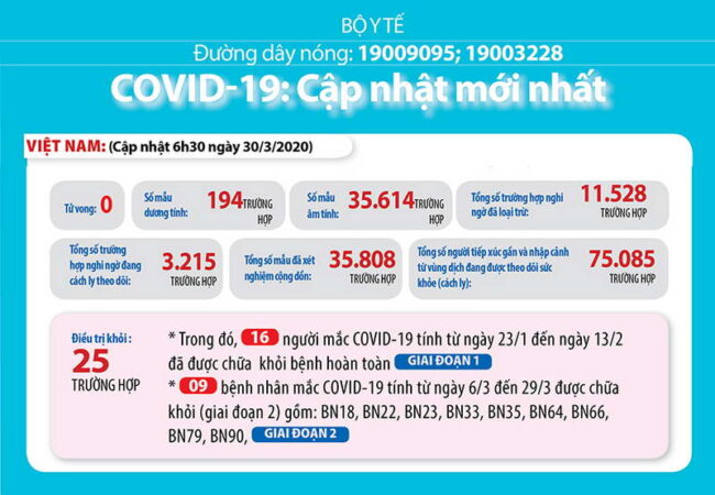 Sáng 30-3-2020, Việt Nam có thêm 6 ca, tổng cộng 194 người bệnh COVID-19
