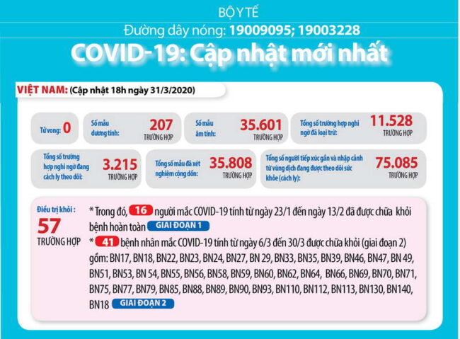 Tính tới tối 31-3-2020, Việt Nam có 207 ca nhiễm virus nCoV COVID-19 (gồm 164 người Việt Nam và 43 người nước ngoài). Giai đoạn 1 (từ 23-1 tới 5-3-2020) có 16 người nhiễm (tính từ ngày 23-1 đến ngày 13-2) đã được chữa khỏi bệnh hoàn toàn. Ca cuối cùng của Giai đoạn 1 đã xuất viện ngày 23-2. Ở Giai đoạn 2, tới ngày 31-3 đã chữa khỏi 41 bệnh nhân COVID-19, trong đó có 14 người nước ngoài. Riêng trong ngày 31-3, có 2 bệnh nhân người nước ngoài là BN49 (người Anh) đang điều trị tại Bệnh viện Trung ương Huế và BN54 (người Latvia) tại Bệnh viện Cần Giờ- TP.HCM được công bố khỏi bệnh. Tất cả bệnh nhân sau khi xuất viện đều phải được áp dụng chế độ cách ly theo dõi y tế trong 14 ngày. Tổng cộng đến nay, Việt Nam đã chữa khỏi 57 người bệnh COVID-19.