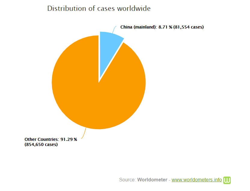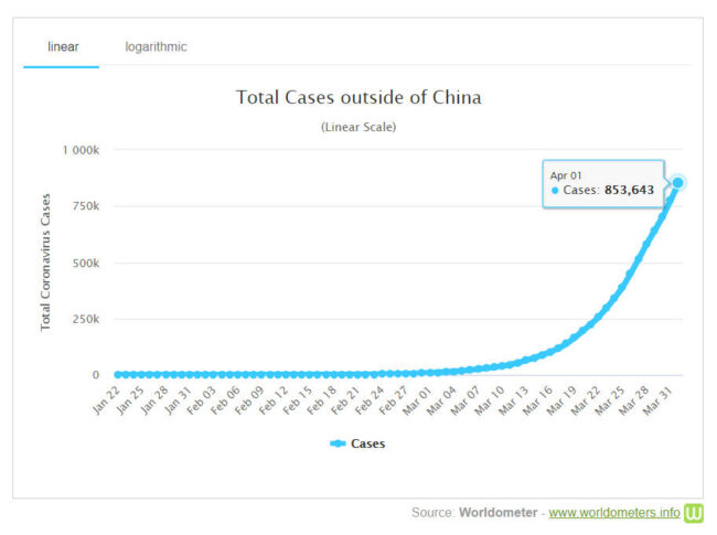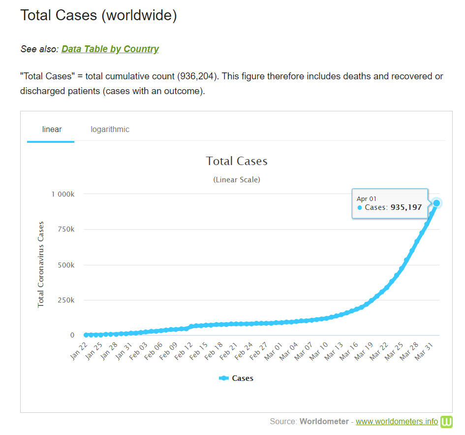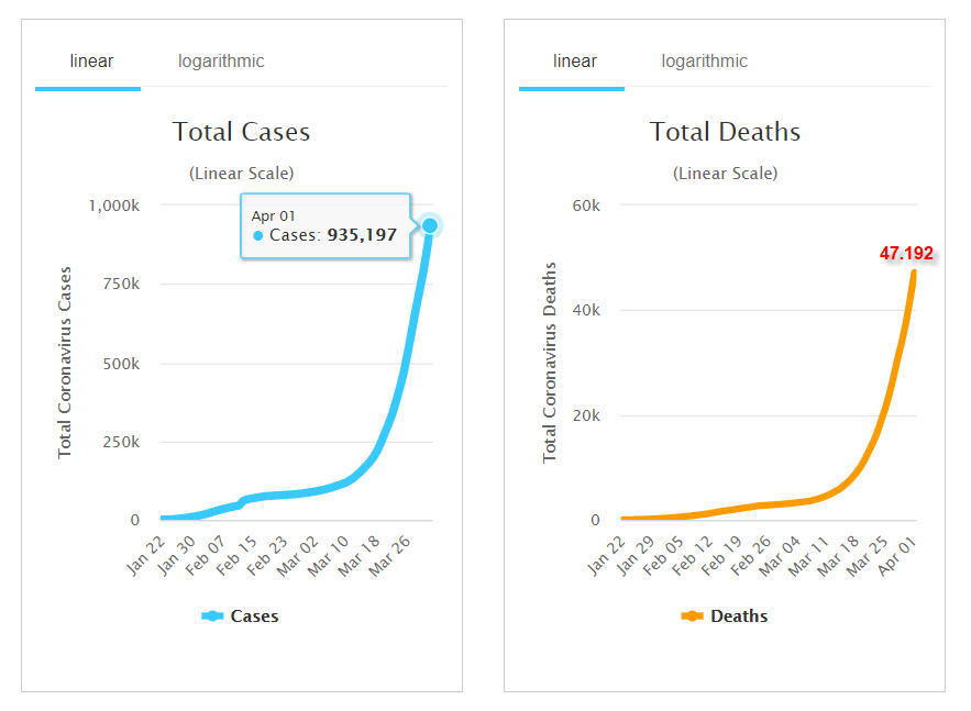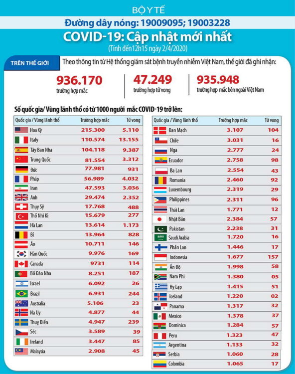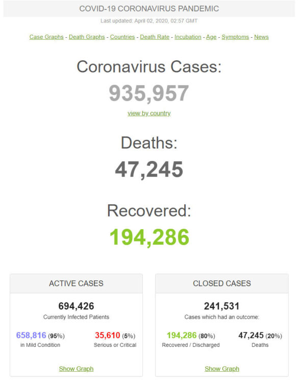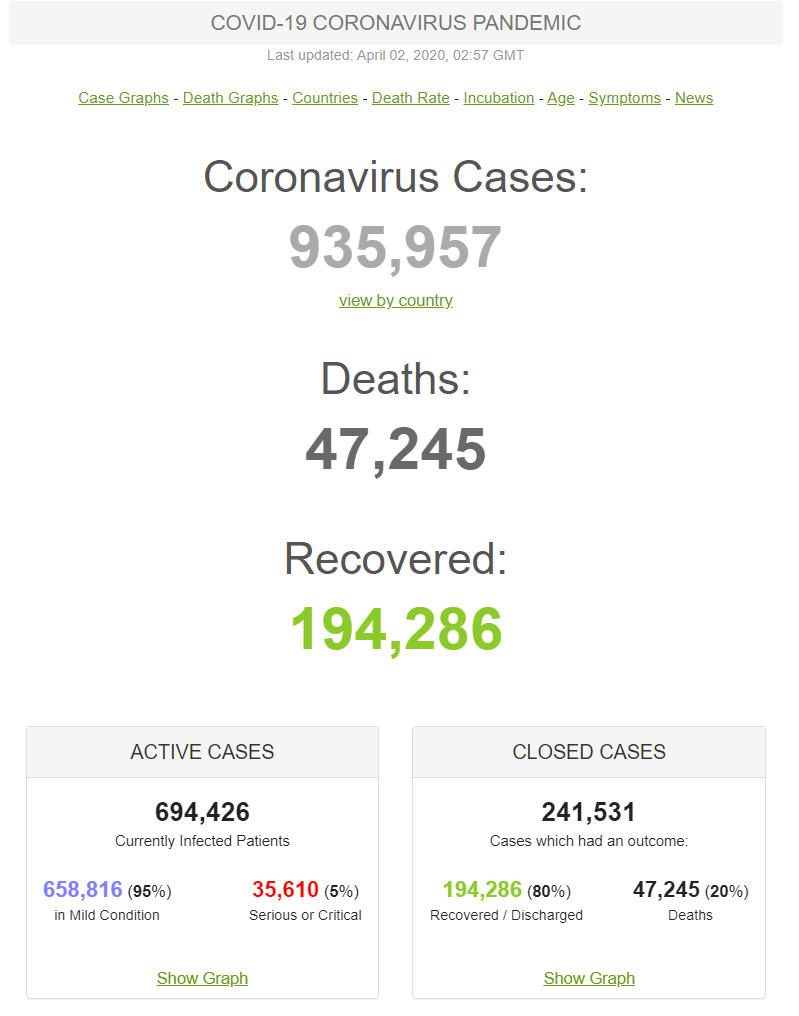 + Theo số liệu của trang Worldometer ngày 2-4-2020, cả thế giới đã có 935.957 người nhiễm virus (tăng từ 858.669 người ngày hôm trước), trong đó có 35.610 người (so với 32.898 người hôm trước) trong tình trạng nặng hay nguy kịch, chiếm 5% trong tổng số đang nhiễm. Riêng ở đại lục Trung Quốc có 81.554 người nhiễm. Có 47.245 người chết (tăng từ 42.151 người ngày hôm trước) tại 138 nước và vùng lãnh thổ (ngày hôm trước là 132 nước và vùng lãnh thổ), trong đó 3.312 người ở đại lục Trung Quốc và 43.933 người ở thế giới bên ngoài (tăng so với 38.846 người ngày hôm trước).
