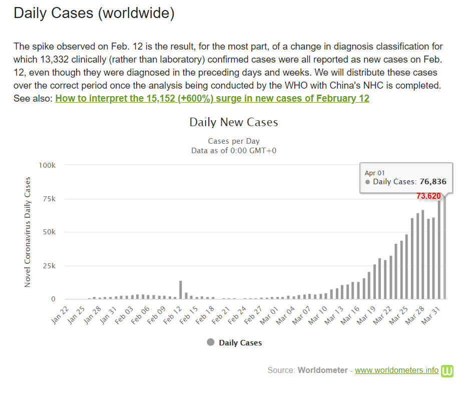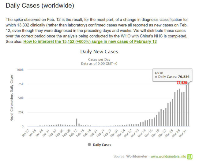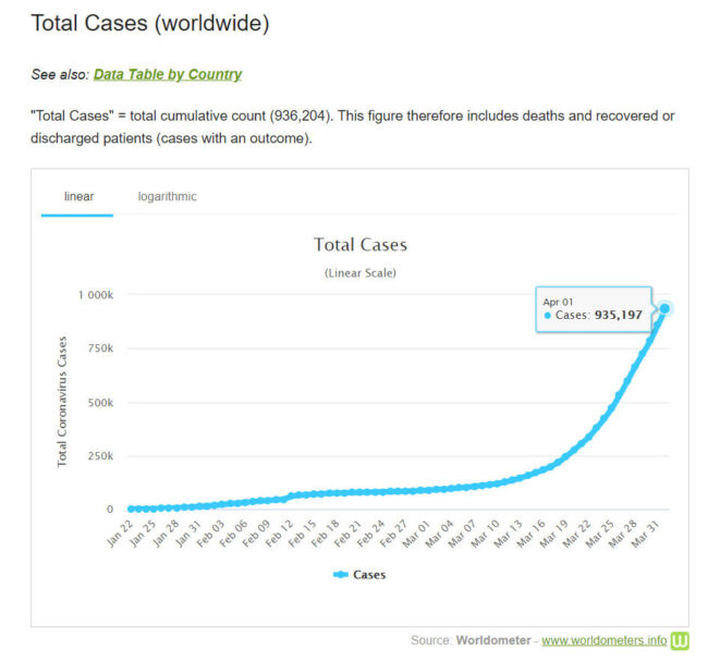 Thế giới trải qua một ngày 1-4-2020 với số người nhiễm và chết trong một ngày đạt mức kỷ lục rất cao, có thêm kỷ lục 76.836 ca nhiễm mới (ngày 31-3 lần đầu tiên vượt mốc 70.000, tăng 73.639 ca) và thêm kỷ lục 4.883 người chết (ngày 31-3 lần đầu tiên vượt mốc 4.000, tăng 4.373 ca). Sáng 2-4, thế giới đã có 203 nước và vùng lãnh thổ có người nhiễm novel coronavirus (SARS-CoV-2) với 935.957 người nhiễm (694.426 người đang điều trị – active cases), có 854.403 người ở 202 nước và vùng lãnh thổ bên ngoài đại lục Trung Quốc. Sáng 2-4 ghi nhận có 47.245 người chết (chiếm 5,04% so với tổng nhiễm); và 194.286 người đã được chữa khỏi (chiếm 20,75% so với tổng nhiễm). Số người nhiễm và tử vong bên ngoài đại lục Trung Quốc đang ngày càng nhiều hơn ở đại lục: lúc ghi nhận sáng 2-4 là 854.650 người nhiễm (91,29%) so với 81.554 người nhiễm (8,71%).