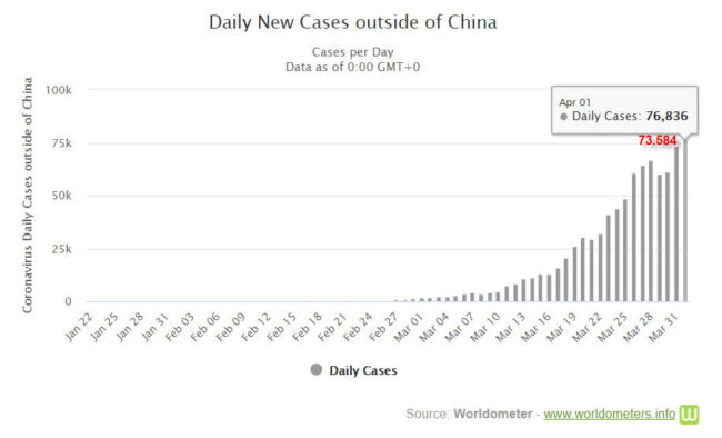 - Ở đại lục Trung Quốc, theo ghi nhận của Worldometer, trong ngày 1-4-2020, số nhiễm mới chưa có báo cáo (ngày 31-3 thêm 36 người) và số tử vong mới không có (ngày 31-7 có thêm 7 người chết). Ở bên ngoài đại lục Trung Quốc trong ngày 1-4 có thêm kỷ lục 76.836 ca nhiễm mới (so với 73.584 ca ngày 31-3).