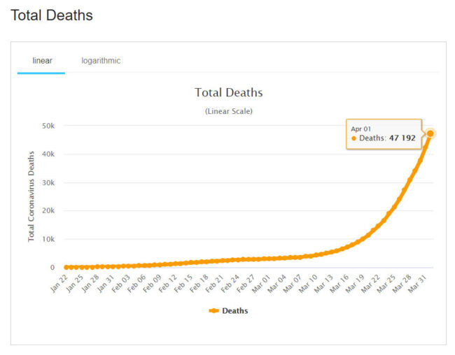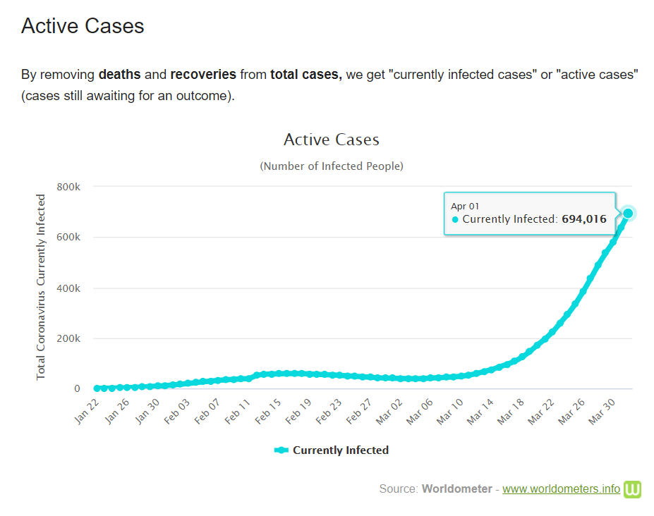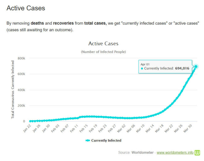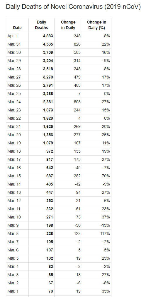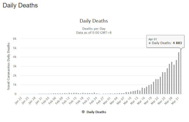 Có 4.883 người chết trong ngày 1-4 (so với 4.373 người ngày hôm trước). Ngày 1-4 là ngày có số lượng người tử vong cao nhất kể từ khi phát hiện ca tử vong đầu tiên ngày 9-1-2020. Số người được chữa khỏi COVID-19 hiện là 194.286 người (tăng từ 178.099 người vào hôm trước). Trừ đi số đã xác định (outcome) bao gồm tử vong, khỏi bệnh và xuất viện (tổng cộng 241.531 người), số người hiện đang nhiễm là 694.426 người (tăng từ 638.419 người hôm trước, tăng trở lại từ ngày 6-3).