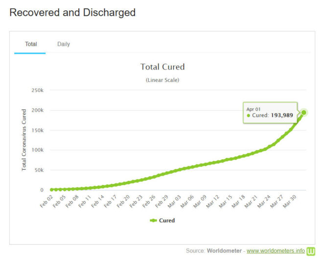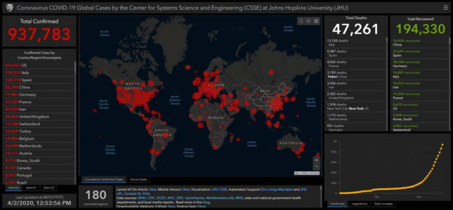 + Trang thông tin cập nhật về dịch Coronavirus COVID-19 Global Cases Johns Hopkins CESE của trường Đại học Y Johns Hopkins, một trường có tiếng ở Mỹ, tính tới sáng 2-4-2020 (theo giờ VN), ghi nhận: có 937.783 trường hợp nhiễm virus được xác nhận trên thế giới (so với 857.957 trường hợp ngày hôm trước), trong đó có 82.394 ca ở Trung Quốc – trừ Taiwan (so với 82.290 ca ngày hôm trước). Có 47.261 người tử vong (so với 42.139 người ngày hôm trước). Và có 194.330 người bệnh đã được điều trị hồi phục (so với 178.091 người ngày hôm trước). Trang này ghi nhận có 63 ca được chữa khỏi ở Việt Nam (ngày 2-4, Việt Nam công bố đã chữa khỏi thêm 48 người trong giai đoạn 2, tổng cộng 64 người đã được chữa khỏi và xuất viện).