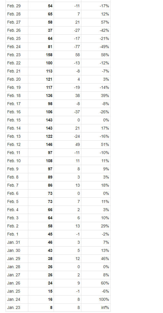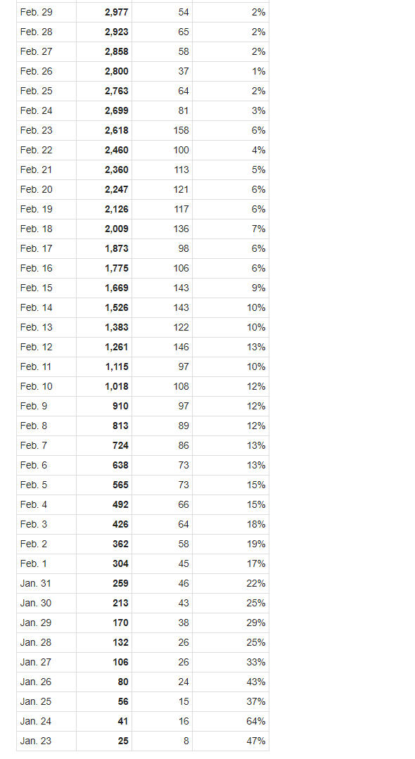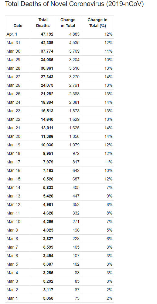 Tốc độ tăng của số tử vong có xu hướng tiếp tục giảm trong nhiều ngày trước đã tăng lại từ ngày 8-3. Trong 7 ngày qua có mức tăng: ngày 26-3 tăng 13%, ngày 27-3 tăng 14% , ngày 28-3 tăng 13%, ngày 29-3 tăng 10%, ngày 30-3 tăng 11%, ngày 31-3 tăng 12%, ngày 1-4 tăng 12%).