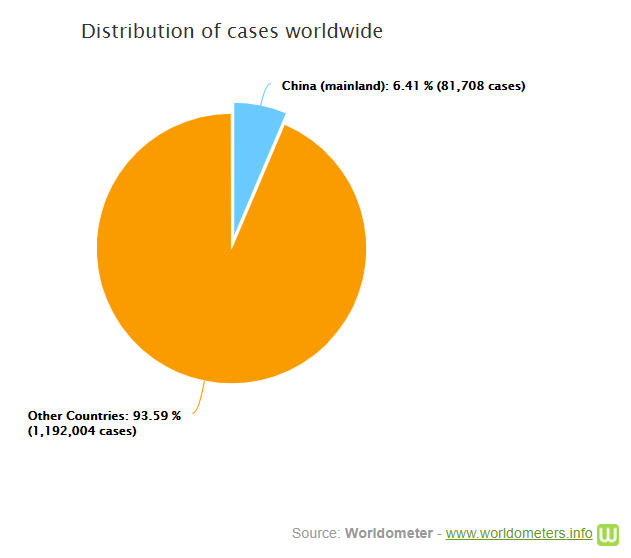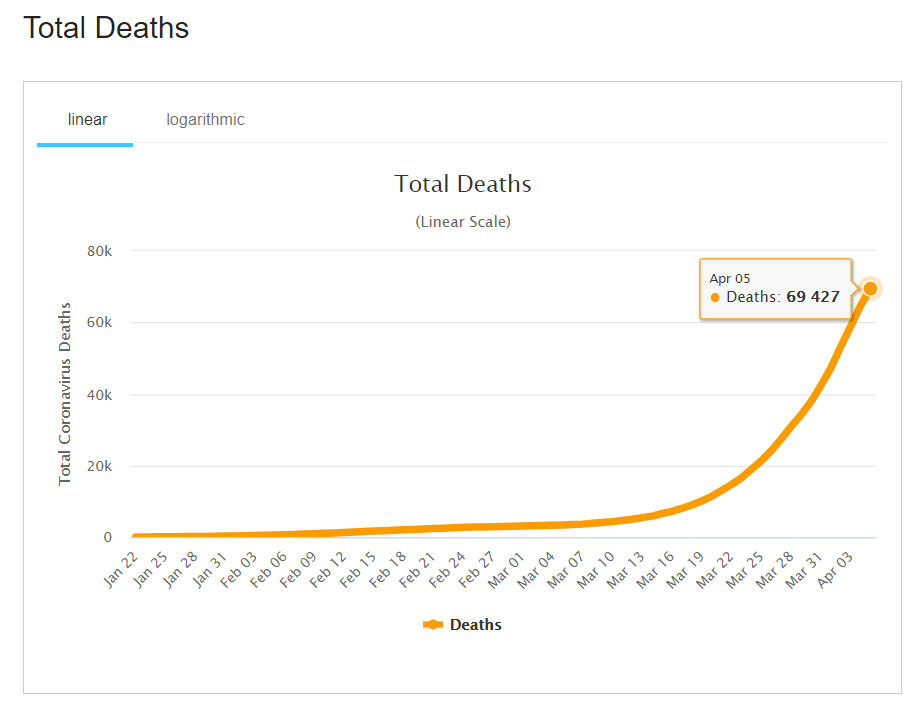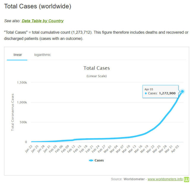+ Theo số liệu của trang Worldometer ngày 6-4-2020, cả thế giới đã có 1.273.712 người nhiễm virus (tăng từ 1.201.933 người ngày hôm trước), trong đó có 45.592 người (so với 42.290 người hôm trước) trong tình trạng nặng hay nguy kịch, chiếm 5% trong tổng số đang nhiễm. Có 69.458 người chết (tăng từ 64.720 người ngày hôm trước) tại 148 nước và vùng lãnh thổ (ngày hôm trước là 144 nước và vùng lãnh thổ), trong đó 3.331 người ở đại lục Trung Quốc và 66.127 người ở thế giới bên ngoài (tăng so với 62.391 người ngày hôm trước).