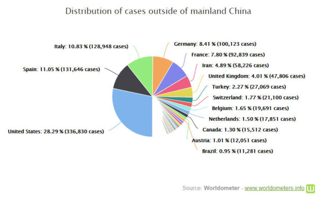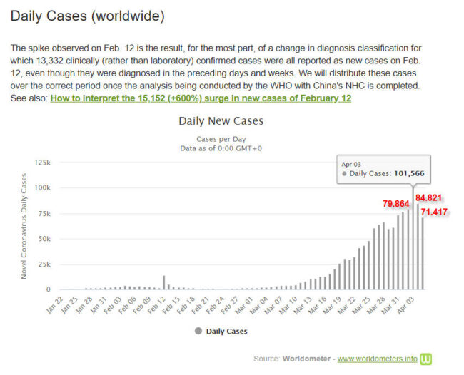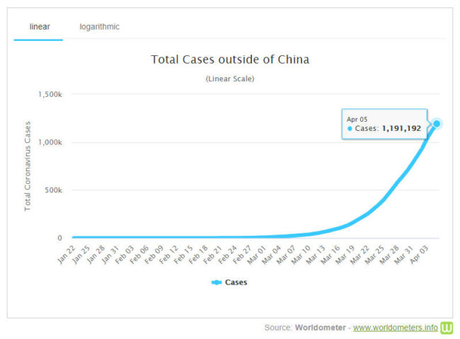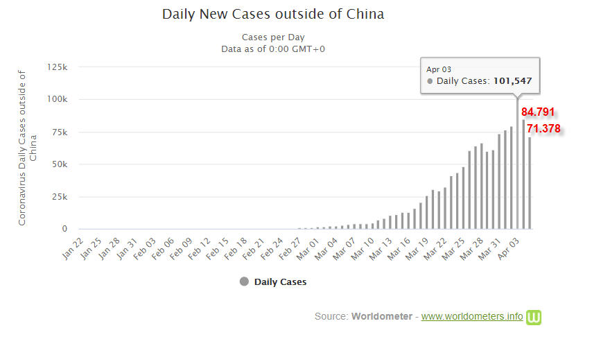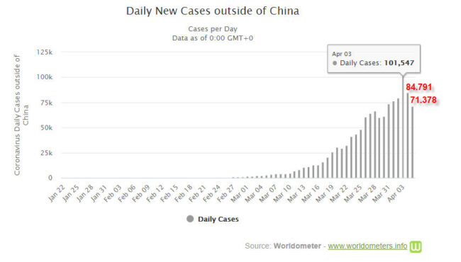 Thế giới trải qua một ngày 5-4-2020 với số người nhiễm và chết trong một ngày đạt mức rất cao, có thêm 71.418 ca nhiễm mới (so với 84.821 của ngày hôm trước) và thêm 4.737 người chết (so với 5.799 ca của ngày hôm trước). Sáng 6-4, thế giới đã có 208 nước và vùng lãnh thổ có người nhiễm novel coronavirus (SARS-CoV-2) với 1.273.712 người nhiễm, so với 1.201.933 ca của ngày hôm trước (941.768 người đang điều trị – active cases), có 1.192.004 người ở 207 nước và vùng lãnh thổ bên ngoài đại lục Trung Quốc. Sáng 6-4 ghi nhận có 69.458 người chết (chiếm 5,45% so với tổng nhiễm); và 262.486 người đã được khỏi bệnh (chiếm 20,60% so với tổng nhiễm). Số người nhiễm và tử vong bên ngoài đại lục Trung Quốc đang ngày càng nhiều hơn ở đại lục: lúc ghi nhận sáng 6-4 là 1.192.004 người nhiễm (93,59%) so với 81.708 người nhiễm (6,41%).
