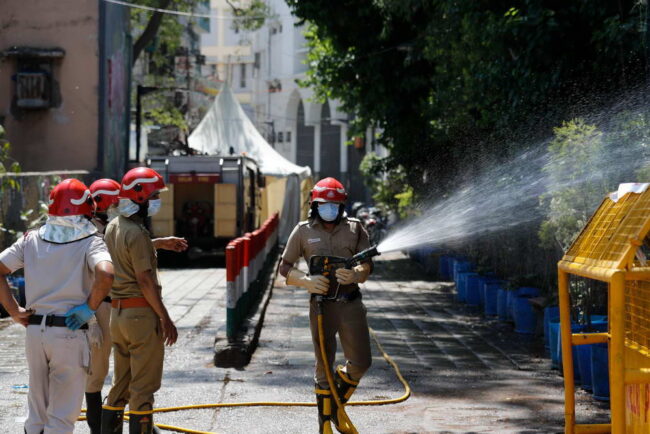 Nhân viên chuyên môn đang phun thuốc thanh trùng Trung tâm Tablighi Jamaat Center, một đền thờ tại New Delhi (Ấn Độ) có liên quan tới hàng ngàn ca nhiễm coronavirus mới. (Ảnh: Manish Swarup/Associated Press/NYT/ Internet. Thanks.)