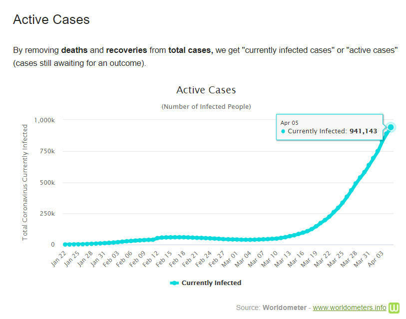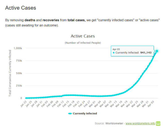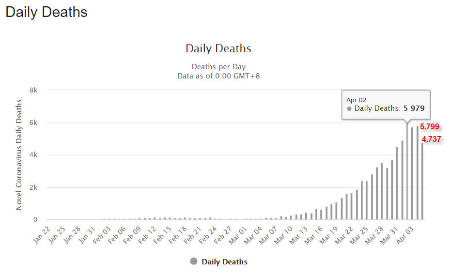 Có 4.737 người chết trong ngày 5-4 (so với 5.799 người ngày hôm trước). Ngày 2-4 là ngày có số lượng người tử vong cao nhất (5.979 người) kể từ khi phát hiện ca tử vong đầu tiên ngày 9-1-2020. Số người đã khỏi bệnh COVID-19 hiện là 262.468 người (tăng từ 246.634 người vào hôm trước). Trừ đi số đã xác định (outcome) bao gồm tử vong, khỏi bệnh và xuất viện (tổng cộng 331.944 người), số người hiện đang nhiễm là 941.768 người (tăng từ 890.579 người hôm trước, tăng trở lại từ ngày 6-3).