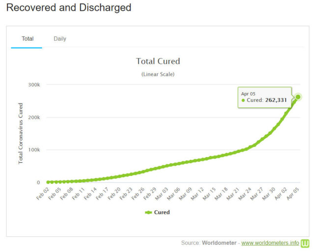+ Trang thông tin cập nhật về dịch Coronavirus COVID-19 Global Cases Johns Hopkins CESE của trường Đại học Y Johns Hopkins, một trường có tiếng ở Mỹ, tính tới sáng 6-4-2020 (theo giờ VN), ghi nhận: có 1.274.923 trường hợp nhiễm virus được xác nhận trên thế giới (so với 1.202.236 trường hợp ngày hôm trước), trong đó có 82.626 ca ở Trung Quốc – trừ Taiwan (so với 82.558 ca ngày hôm trước). Có 69.479 người tử vong (so với 64.753 người ngày hôm trước). Và có 260.484 người bệnh đã được điều trị hồi phục (so với 246.457 người ngày hôm trước). Trang này ghi nhận có 90 ca đã khỏi bệnh ở Việt Nam (ngày 5-4, Việt Nam công bố đã có thêm 75 người trong giai đoạn 2, tổng cộng 91 người đã khỏi bệnh và xuất viện).