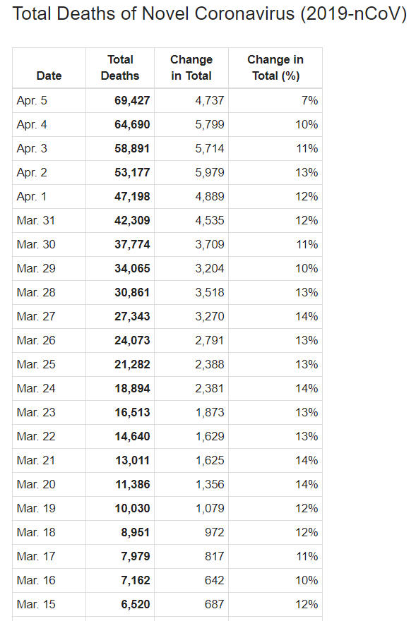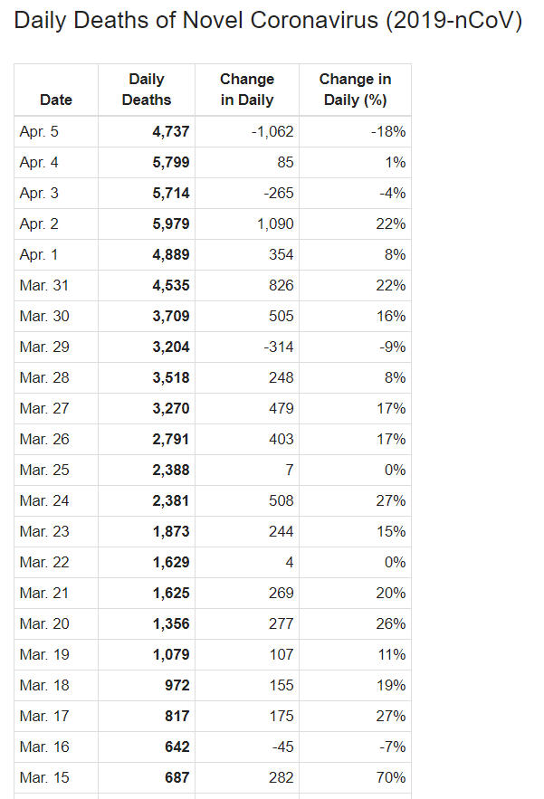 Tốc độ tăng của số tử vong có xu hướng tiếp tục giảm trong nhiều ngày trước đã tăng lại từ ngày 8-3. Trong 7 ngày qua có mức tăng: ngày 30-3 tăng 11%, ngày 31-3 tăng 12%, ngày 1-4 tăng 12%, ngày 2-4 tăng 13%, ngày 3-4 tăng 11%, ngày 4-4 tăng 10%, ngày 5-4 tăng 7%).