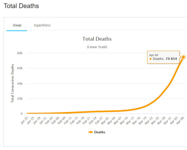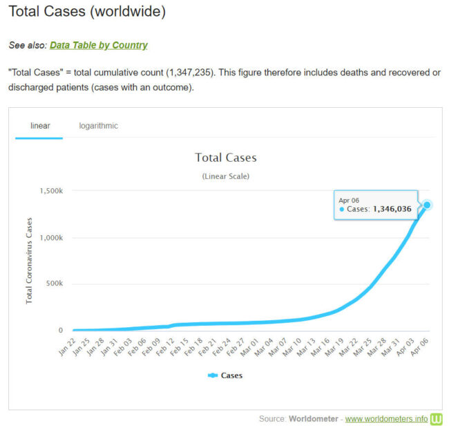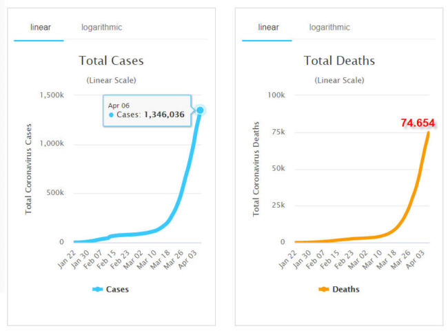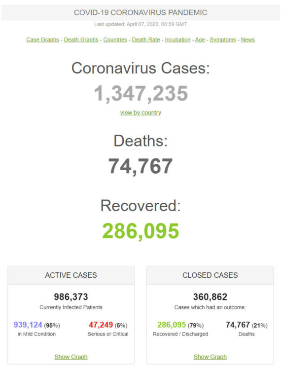+ Theo số liệu của trang Worldometer ngày 7-4-2020, cả thế giới đã có 1.347.235 người nhiễm virus (tăng từ 1.273.712 người ngày hôm trước), trong đó có 47.249 người (so với 45.592 người hôm trước) trong tình trạng nặng hay nguy kịch, chiếm 5% trong tổng số đang nhiễm. Có 74.767 người chết (tăng từ 69.458 người ngày hôm trước) tại 155 nước và vùng lãnh thổ (ngày hôm trước là 148 nước và vùng lãnh thổ), trong đó 3.331 người ở đại lục Trung Quốc và 71.436 người ở thế giới bên ngoài (tăng so với 66.127 người ngày hôm trước).