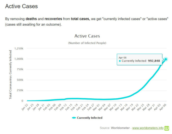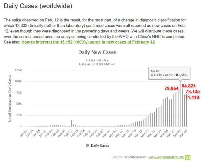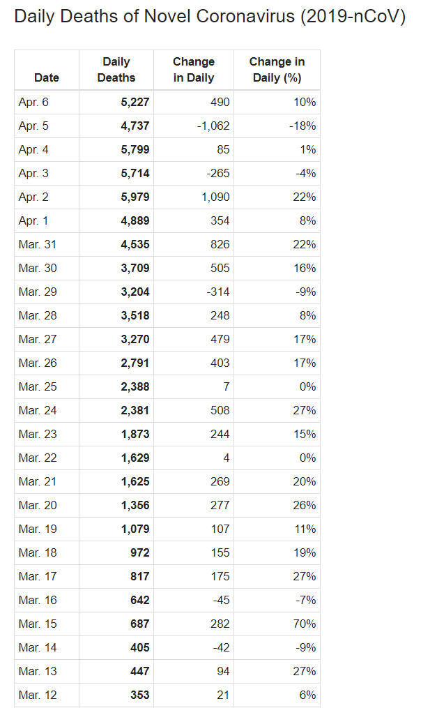 Có 5.227 người chết trong ngày 6-4 (so với 4.737 người ngày hôm trước). Ngày 2-4 là ngày có số lượng người tử vong cao nhất (5.979 người) kể từ khi phát hiện ca tử vong đầu tiên ngày 9-1-2020. Số người đã khỏi bệnh COVID-19 hiện là 286.095 người (tăng từ 262.468 người vào hôm trước). Trừ đi số đã xác định (outcome) bao gồm tử vong, khỏi bệnh và xuất viện (tổng cộng 360.862 người), số người hiện đang nhiễm là 986.373 người (tăng từ 941.768 người hôm trước, tăng trở lại từ ngày 6-3).