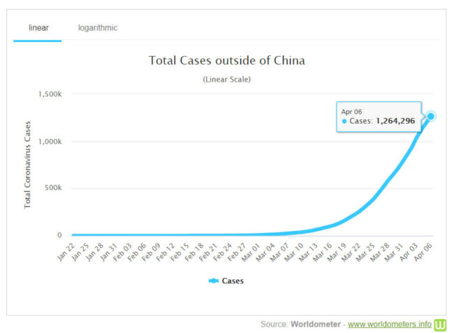 Ngày 6-4 có 1.264.296 người bệnh COVID-19 (nCoV) (tăng so với 1.191.192 người ngày 5-4) tại 208 nước và vùng lãnh thổ bên ngoài đại lục Trung Quốc đã có người nhiễm Wuhan coronavirus.