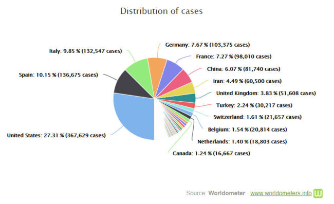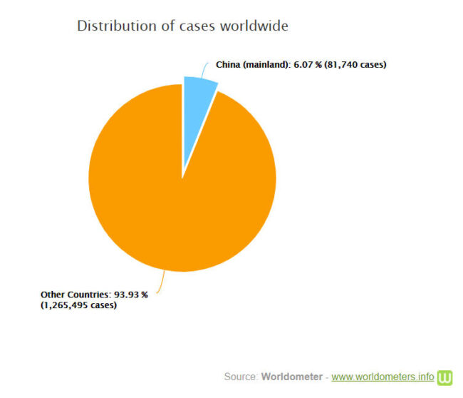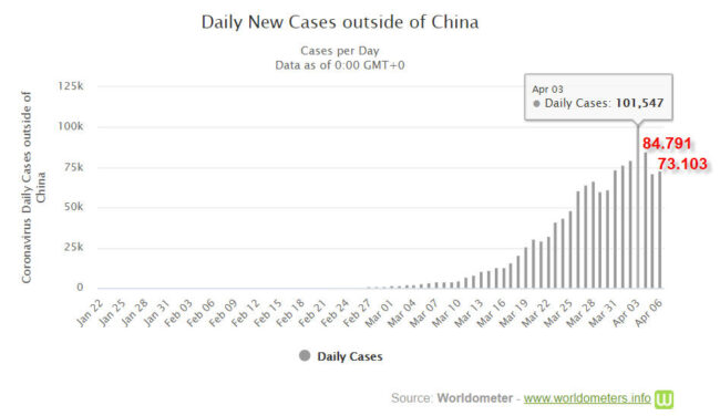 Thế giới trải qua một ngày 6-4-2020 với số người nhiễm và chết trong một ngày đạt mức rất cao, có thêm 73.135 ca nhiễm mới (so với 71.418 của ngày hôm trước) và thêm 5.227 người chết (so với 4.737 ca của ngày hôm trước). Sáng 7-4, thế giới đã có 209 nước và vùng lãnh thổ có người nhiễm novel coronavirus (SARS-CoV-2) với 1.347.235 người nhiễm, so với 1.273.712 ca của ngày hôm trước (986.373 người đang điều trị – active cases), có 1.265.495 người ở 208 nước và vùng lãnh thổ bên ngoài đại lục Trung Quốc. Sáng 7-4 ghi nhận có 74.767 người chết (chiếm 5,54% so với tổng nhiễm); và 286.095 người đã được khỏi bệnh (chiếm 21,23% so với tổng nhiễm). Số người nhiễm và tử vong bên ngoài đại lục Trung Quốc đang ngày càng nhiều hơn ở đại lục: lúc ghi nhận sáng 5-4 là 1.265.495 người nhiễm (93,93%) so với 81.740 người nhiễm (6,07%).