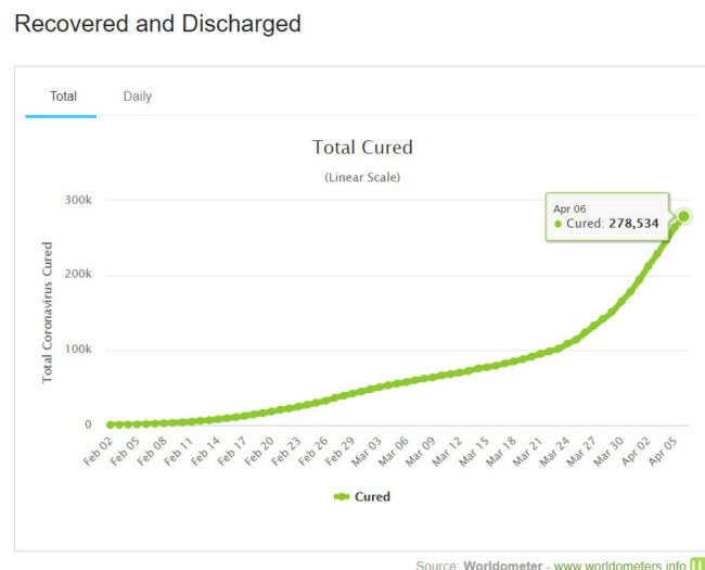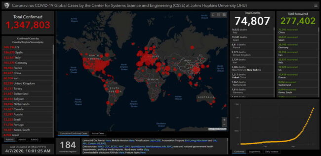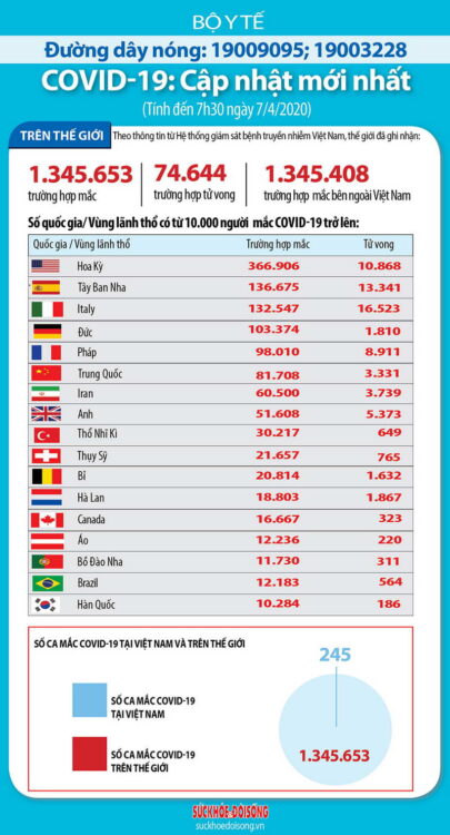 + Trang thông tin cập nhật về dịch Coronavirus COVID-19 Global Cases Johns Hopkins CESE của trường Đại học Y Johns Hopkins, một trường có tiếng ở Mỹ, tính tới sáng 7-4-2020 (theo giờ VN), ghi nhận: có 1.347.803 trường hợp nhiễm virus được xác nhận trên thế giới (so với 1.274.923 trường hợp ngày hôm trước), trong đó có 82.697 ca ở Trung Quốc – trừ Taiwan (so với 82.626 ca ngày hôm trước). Có 74.807 người tử vong (so với 69.479 người ngày hôm trước). Và có 277.402 người bệnh đã được điều trị hồi phục (so với 260.484 người ngày hôm trước). Trang này ghi nhận có 95 ca đã khỏi bệnh ở Việt Nam.
