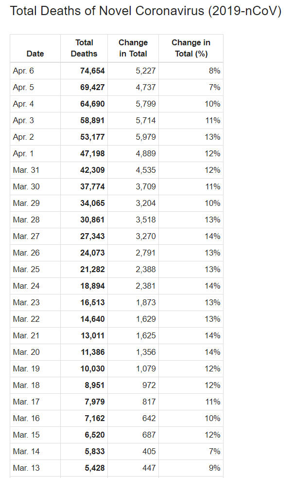 Tốc độ tăng của số tử vong có xu hướng tiếp tục giảm trong nhiều ngày trước đã tăng lại từ ngày 8-3. Trong 7 ngày qua có mức tăng: ngày 31-3 tăng 12%, ngày 1-4 tăng 12%, ngày 2-4 tăng 13%, ngày 3-4 tăng 11%, ngày 4-4 tăng 10%, ngày 5-4 tăng 7%, ngày 6-4 tăng 8%).