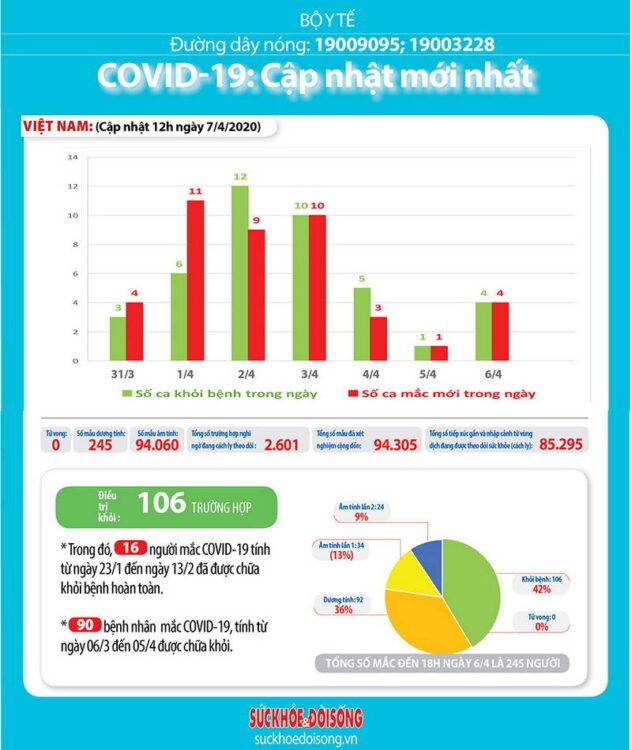 Theo số liệu của Bộ Y tế, tính tới trưa 7-4-2020, trong tổng số 245 người bệnh COVID-19 ở Việt Nam, có 106 người (42%) đã khỏi bệnh; 92 người (36%) còn đang dương tính; 34 người (13%) âm tính lần 1; 24 người (9%) âm tính lần 2; chưa có ca tử vong.