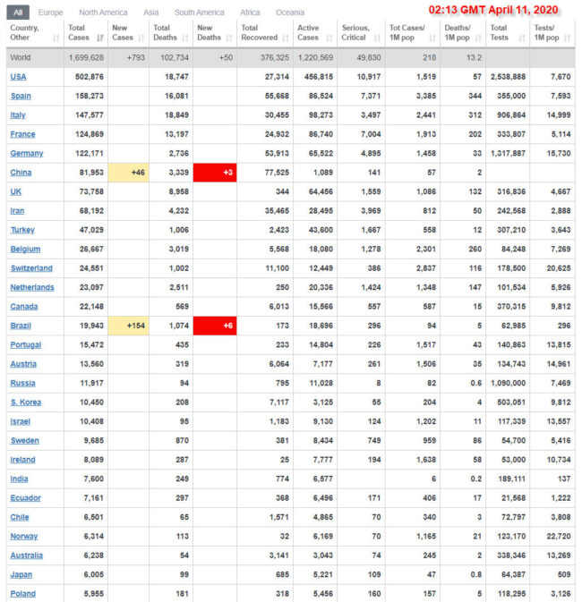 * Thế giới: 1.697.533 người mắc bệnh COVID-19; 102.687 người tử vong.