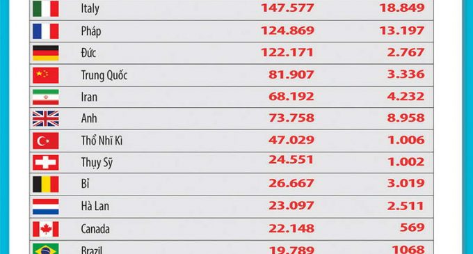 * Việt Nam: 257 ca mắc COVID-19, không có ca tử vong.Trong đó có 144 ca đã được công bố khỏi bệnh và 113 ca bệnh đang được điều trị tại các cơ sở y tế ở nhiều tỉnh thành.