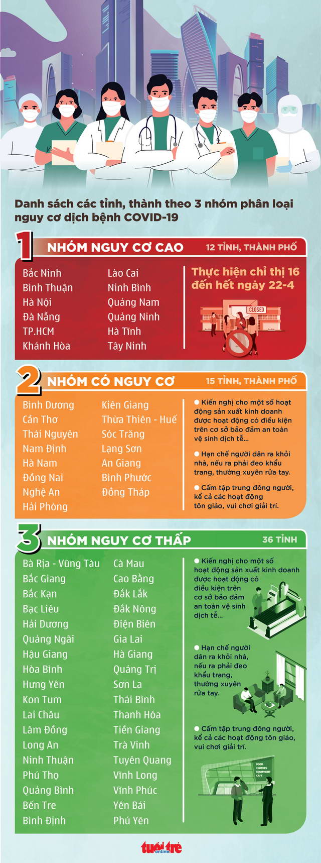 Đối với 15 tỉnh thành thuộc nhóm có nguy cơ là Bình Dương, Cần Thơ, Đồng Nai, Hà Nam, Hải Phòng, Kiên Giang, Thái Nguyên, Nam Định, Nghệ An, Thừa Thiên Huế, Sóc Trăng, Lạng Sơn, An Giang, Bình Phước, Đồng Tháp; Thủ tướng yêu cầu thực hiện Chỉ thị 15 kết hợp Chỉ thị 16 đến ngày 22-4.