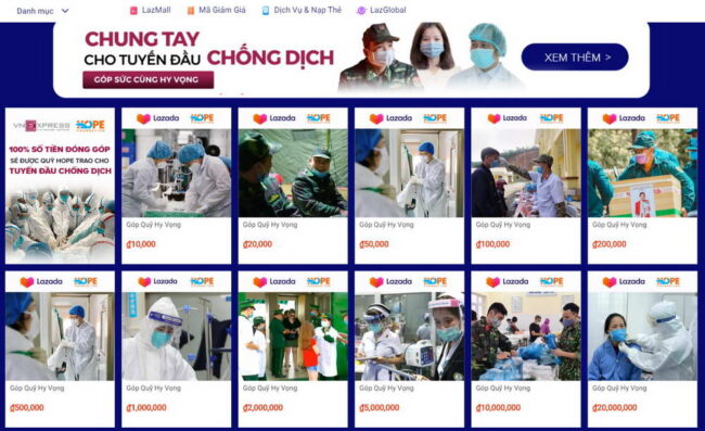 Nền tảng thương mại điện tử Lazada và Quỹ Hy vọng ngày 16-4-2020 đã khởi động chương trình “Chung tay chống dịch COVID-19” thông qua hình thức quyên góp trực tuyến trên nền tảng Lazada. Đây là hoạt động nằm trong khuôn khổ của sáng kiến “Lazada vì cộng đồng”, với sự phối hợp của Quỹ Hy vọng – quỹ xã hội và từ thiện của báo điện tử VnExpress và Công ty FPT. Theo Lazada, tất cả số tiền đóng góp từ nay đến hết tháng 5-2020 sẽ được sử dụng để hỗ trợ những người đang tham gia ở tuyến đầu trong cuộc chiến chống lại đại dịch COVID-19.