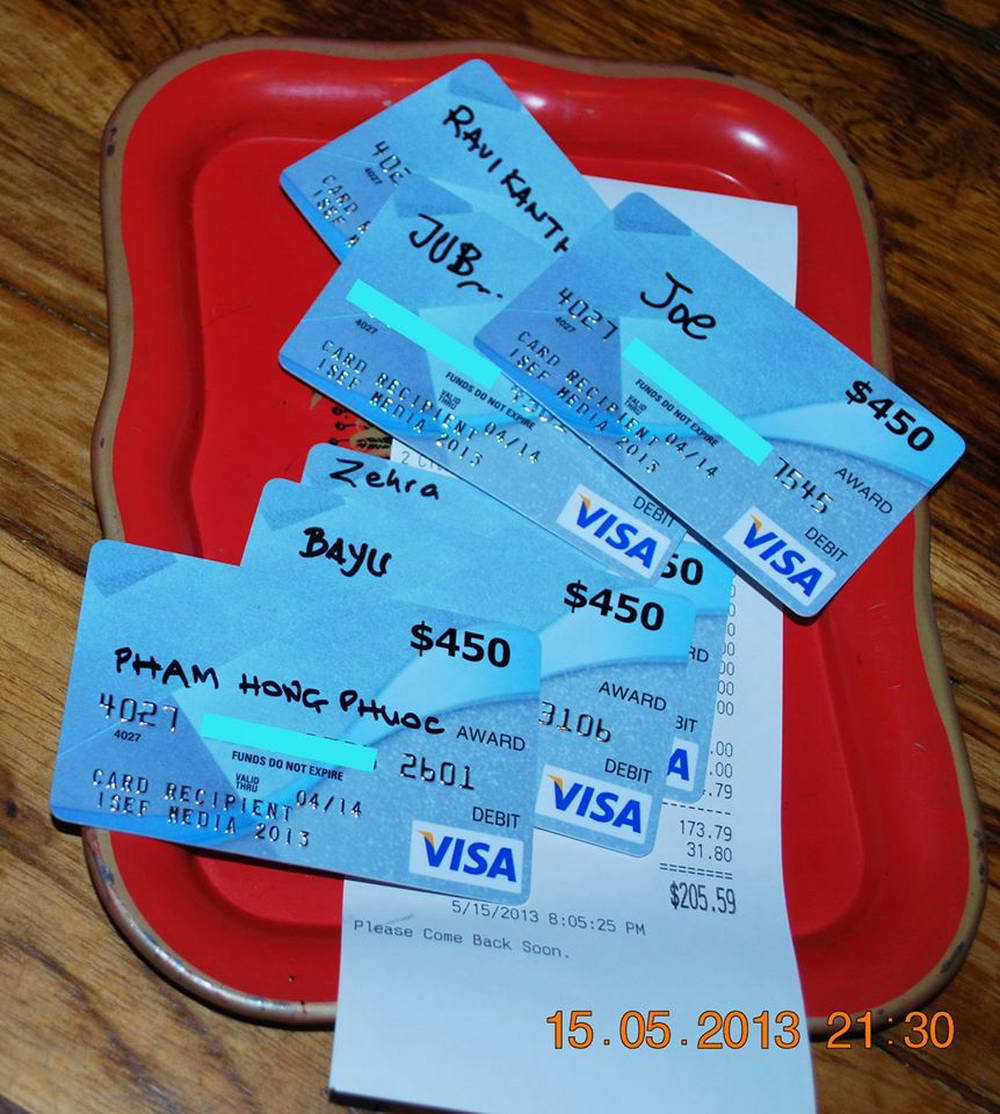 Ăn xong, thanh toán kiểu Mỹ. Do không thể phần ai nấy trả, tổng tiền (cả thức ăn và tip) chia đều cho số khách. Vậy là mỗi người đưa thẻ debit của mình ra cho nhà hàng trừ vào từng thẻ. Mỗi người phải ghi tên mình lên thẻ để khỏi lộn. À đây là các thẻ VISA Debit do Intel cấp cho mỗi khách mời để tự lo ăn uống trong thời gian sự kiện. Những năm trước, khách mời dự IDF được Intel cấp thẻ American Express Debit rất khó xài (thẻ bank Mỹ mà ngay cả ở Mỹ cũng không nhiều cửa hàng chấp nhận, báo hại trước khi vô đâu lại phải coi có để bảng chấp nhận hay phải hỏi trước). Sau đó, Intel chuyển sang xài thẻ VISA.