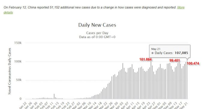 Thế giới trải qua một ngày 21-5-2020 với số người nhiễm và chết vẫn ở mức rất cao, có thêm kỷ lục mới 107.085 ca nhiễm mới (so với 100.474 của ngày hôm trước) và thêm 4.934 người chết (so với 4.685 người của ngày hôm trước).