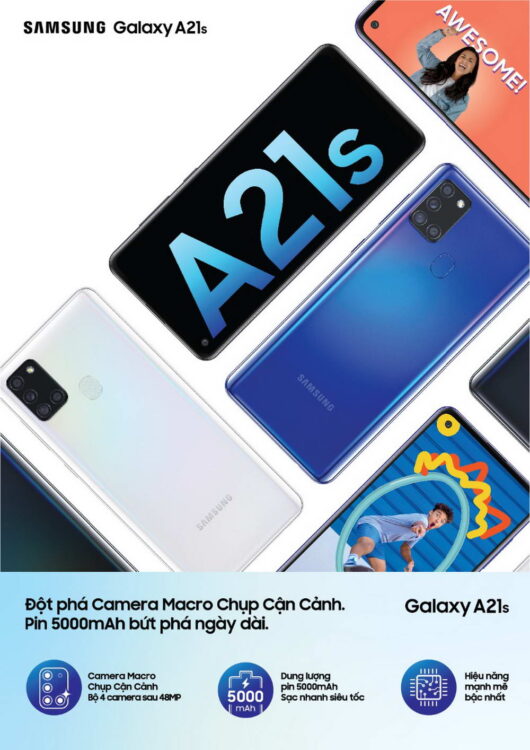 Công ty Điện tử Samsung Vina ngày 27-5-2020 đã giới thiệu smartphone Galaxy A21s tại thị trường Việt Nam. Mang các công nghệ mới nhất của thế hệ smartphone đột phá Galaxy A series 2020 đến với nhiều người dùng trẻ, Galaxy A21s với thiết kế màn hình tràn viền vô cực Infinity-O thường thấy trên các dòng điện thoại cao cấp của Samsung được trang bị bộ 4 camera sau 48MP, trong đó có camera macro chụp cận cảnh. Dung lượng pin lên đến 5.000mAh, thuộc hàng lớn nhất dòng Galaxy A, hỗ trợ công nghệ sạc nhanh siêu tốc 15W.
