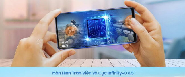 Galaxy A21s có thiết kế màn hình tràn viền vô cực Infinity-O thời thượng với kích thước 6.5 inch, độ phân giải HD+, màn hình rộng tỉ lệ 20:9 chuẩn điện ảnh. Màn hình tràn viền vô cực Infinity-O này thường được trang bị trên các smartphone cao cấp của Samsung với một lỗ nhỏ cho camera selfie ở góc trên bên trái để vừa bảo đảm tính thẩm mỹ, vừa mang đến trải nghiệm hình ảnh rộng mở cho người dùng. Phần khuyết chữ O siêu nhỏ kết hợp với phần viền siêu mỏng sẽ tối ưu hóa trải nghiệm xem của người dùng, giúp họ đắm chìm vào thế giới giải trí đa phương tiện đầy màu sắc.