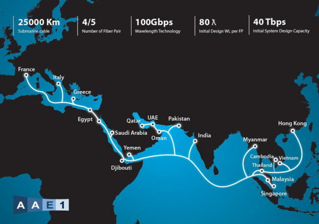 AAE-1 (Asia Africa Europe) được đưa vào sử dụng tháng 7-2017 là hệ thống cáp biển đầu tiên kết nối tất cả các khu vực Châu Á, Trung Đông, Châu Phi, Châu Âu với độ trễ kết nối thấp nhất giữa các khu vực này. AAE-1 dài 25.000km được kết nối tại các trung tâm dữ liệu (Data Center) lớn nhất thế giới như tại Hong Kong (Telecom House), Singapore (Equinix và Global Switch), Pháp (Interxion Marseille – MRS1 và MRS2). Nó có các điểm rẽ nhánh cập bờ tại Hong Kong, Việt Nam, Campuchia, Thái Lan, Malaysia, Singapore, Myanmar, Pakistan, Ấn Độ, Oman, UAE, Qatar, Yemen, Arab Saudi, Djibouti, Ai Cập, Hy Lạp, Ý, Pháp. Phía Việt Nam tham gia đầu tư vào tuyến cáp này là VNPT và Viettel Group.