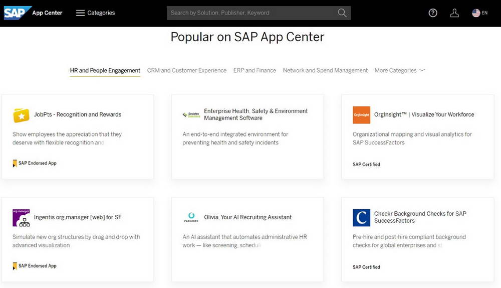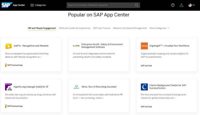 Hiện tại, SAP App Center có hơn 1.500 giải pháp do đối tác xây dựng, dành cho tất cả các dòng sản phẩm và ngành công nghiệp của SAP. Khách hàng có thể dễ dàng tìm kiếm các giải pháp dựa trên sản phẩm SAP mà họ muốn đầu tư mở rộng, dựa trên cấp độ chứng nhận, nhà cung cấp hoặc loại giải pháp, với định dạng thân thiện với người dùng. Các cải tiến được giới thiệu lần này bao gồm các trang sản phẩm nâng cao và các nút kêu gọi hành động (call to action) hợp lý.