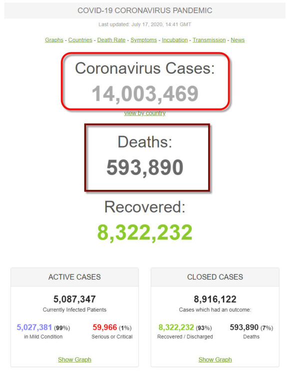 Tối thứ Sáu 17-7-2020 (theo giờ VN) – tức vào lúc 14:40 GMT ngày 17-7-2020, trang Worldometer cập nhật: thế giới có tổng số người nhiễm virus SARS-CoV-2 gây đại dịch COVID-19 vượt qua mốc 14 triệu người ở 213 nước và vùng lãnh thổ. Đã có 593.890 ngườ chết vì bệnh COVID-19 tại 185 nước và vùng lãnh thổ. Trong số các nước và vùng lãnh thổ có dịch COVID-19, chỉ còn 28 nước là chưa ghi nhận ca tử vong nào, trong đó có Việt Nam.