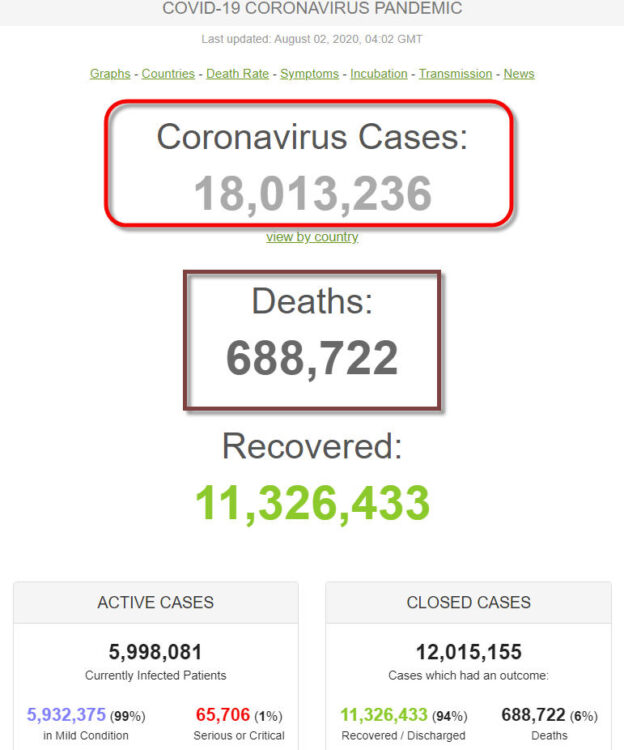 Khuya 1-8-2020, thế giới lại vượt mốc 18 triệu người nhiễm virus corona SARS-CoV-2. Một tốc độ thần tốc, nhanh chưa từng có, chỉ mất có 3 ngày (ngày 29-7 vượt mốc 17 triệu người). Sáng 2-8, trang Worldometer cập nhật thế giới tới nay đã có 18.013.236 bệnh nhân COVID-19 tại 213 nước và vùng lãnh thổ và có 688.799 người đã chết (chiếm 3,82% tổng nhiễm) tại 188 nước và vùng lãnh thổ. Có 11.326.433 bệnh nhân khỏi bệnh (chiếm 62,87% tổng nhiễm). 200 nước và vùng lãnhg thổ trên thế giới hiện đang phải điều trị cho 5.998.081 bệnh nhân COVID-19, trong đó có 65.706 ca nghiêm trọng.